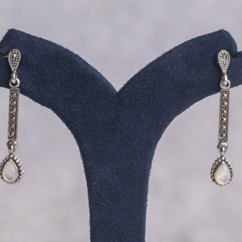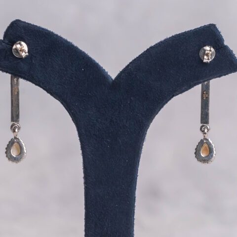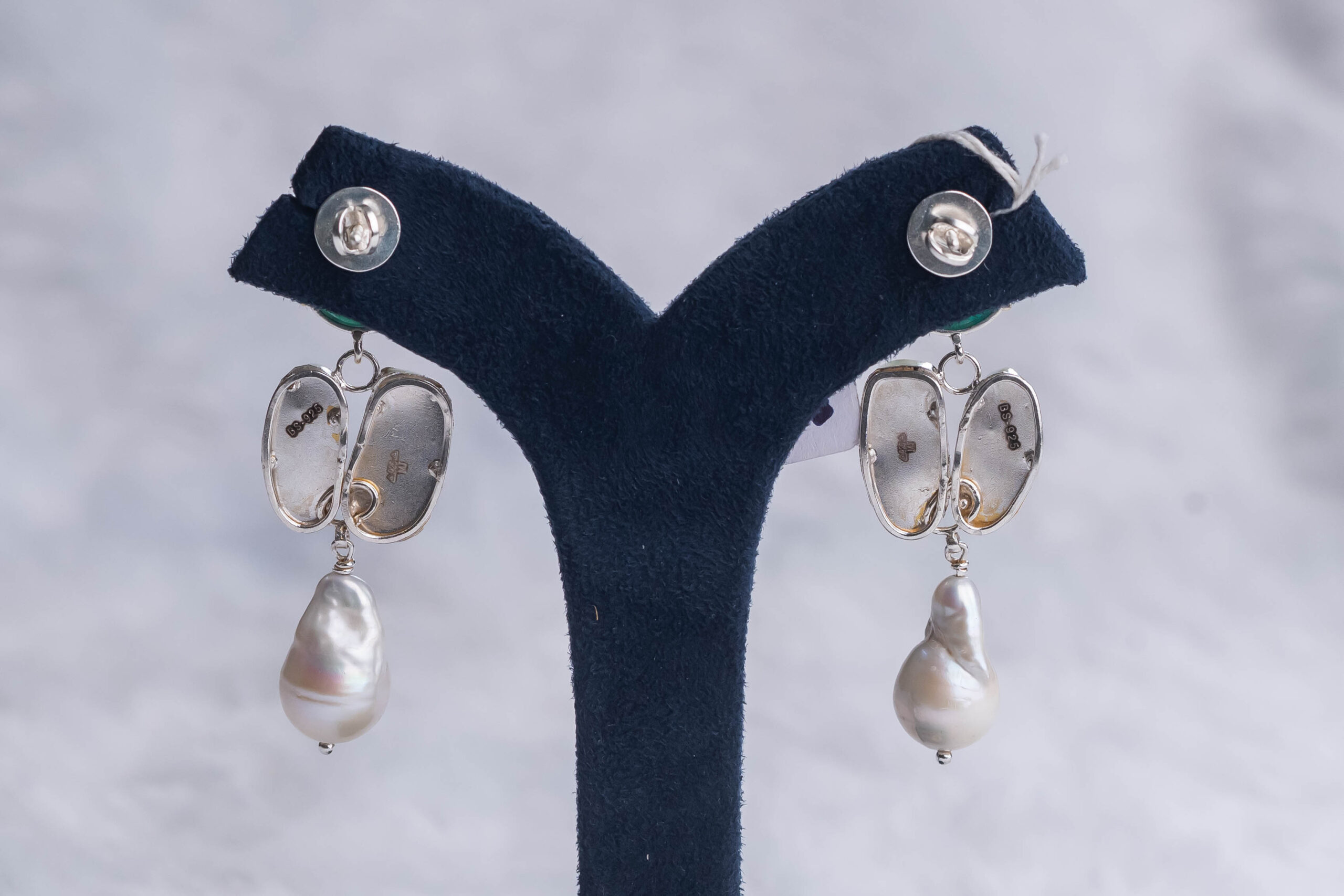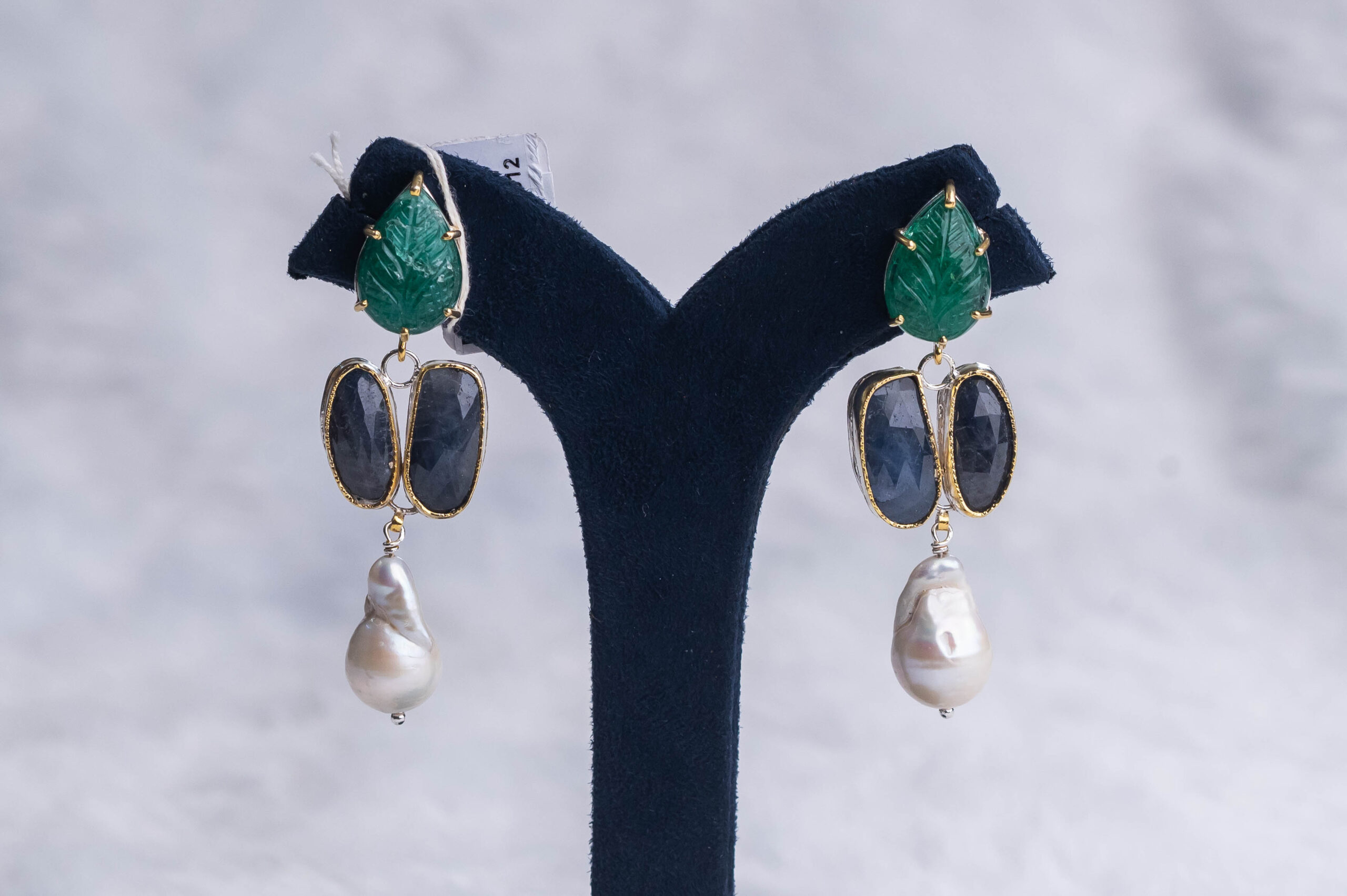 Statement earrings featuring emerald leaf design and baroque pearls.