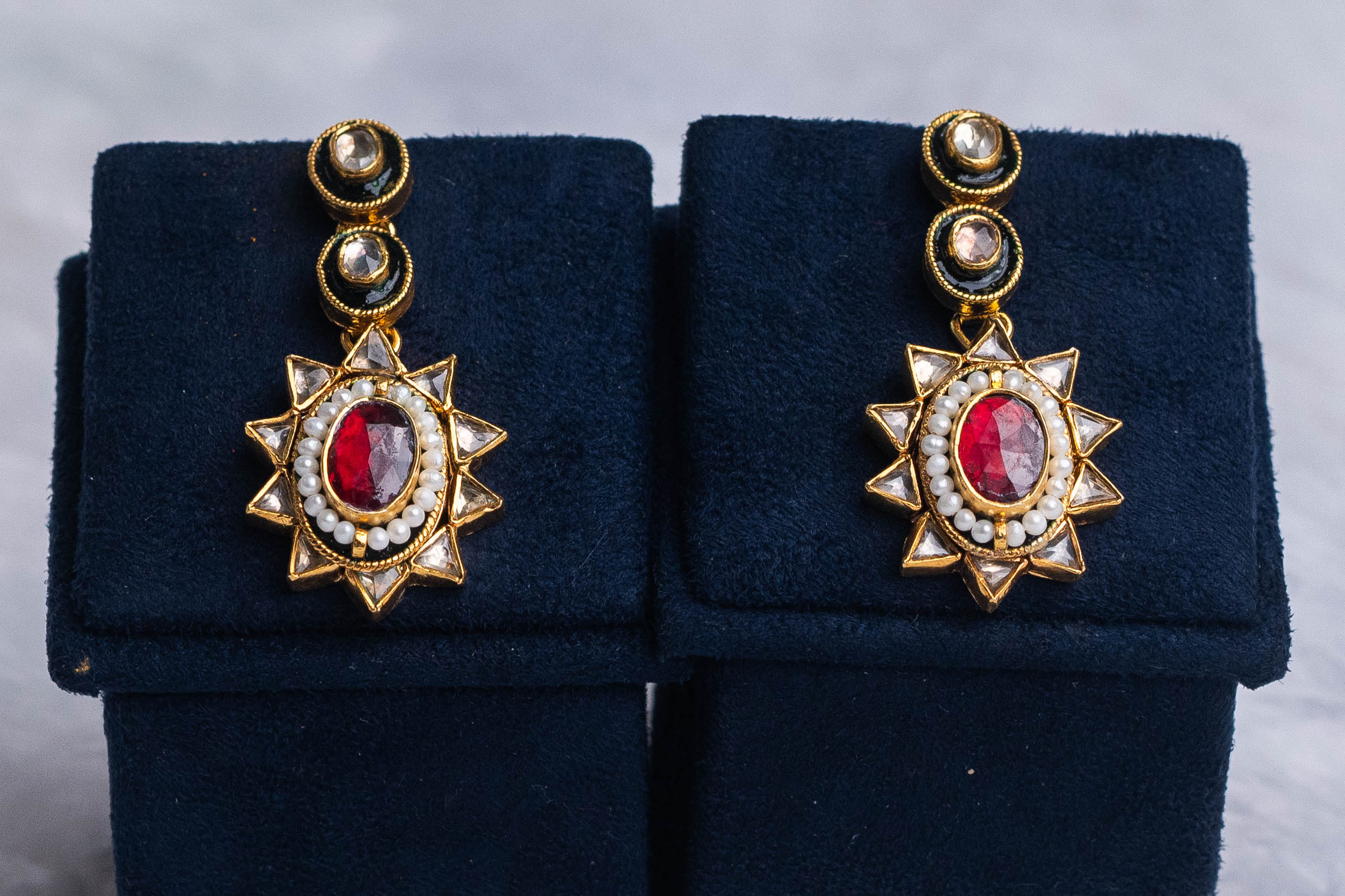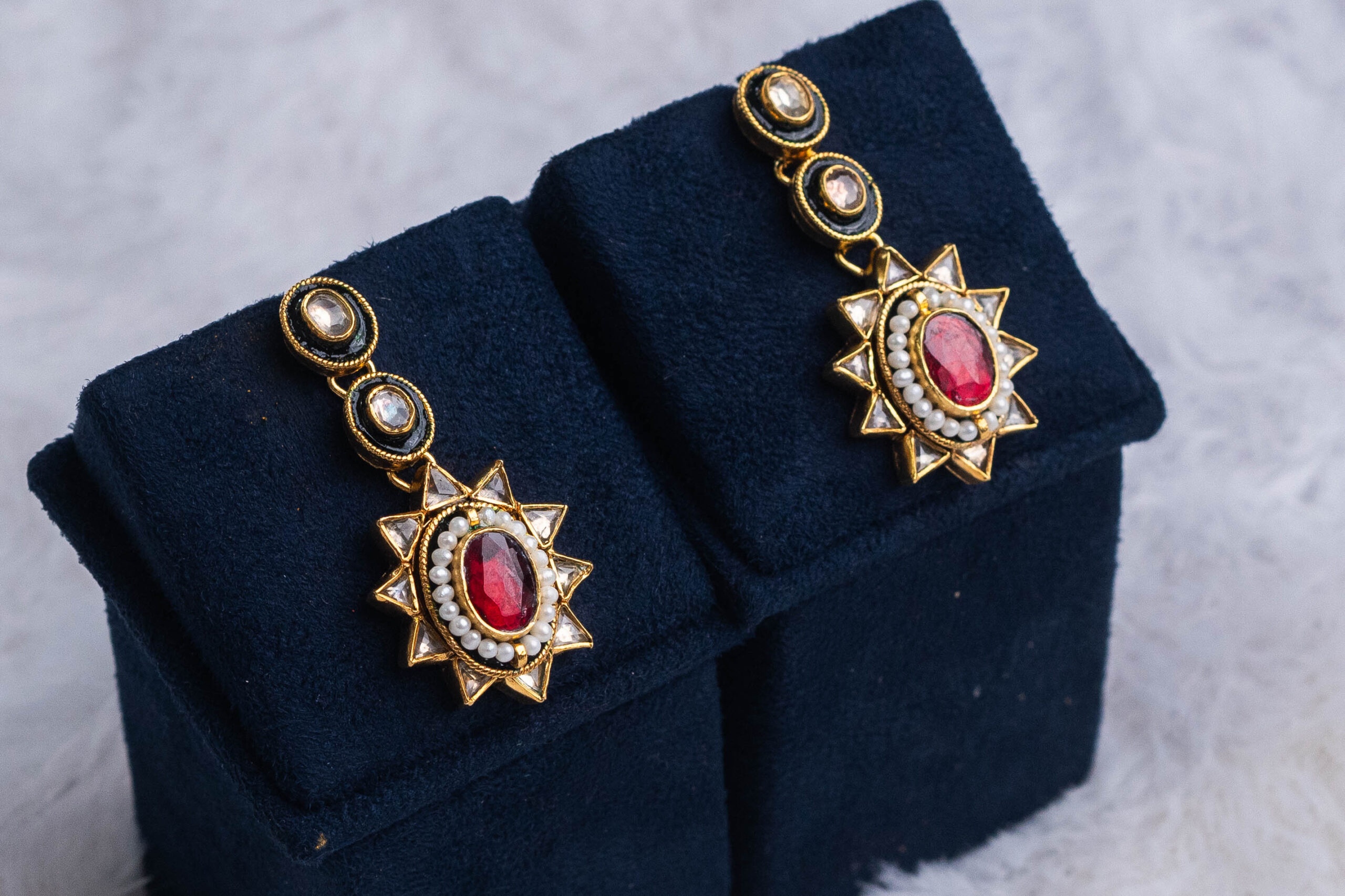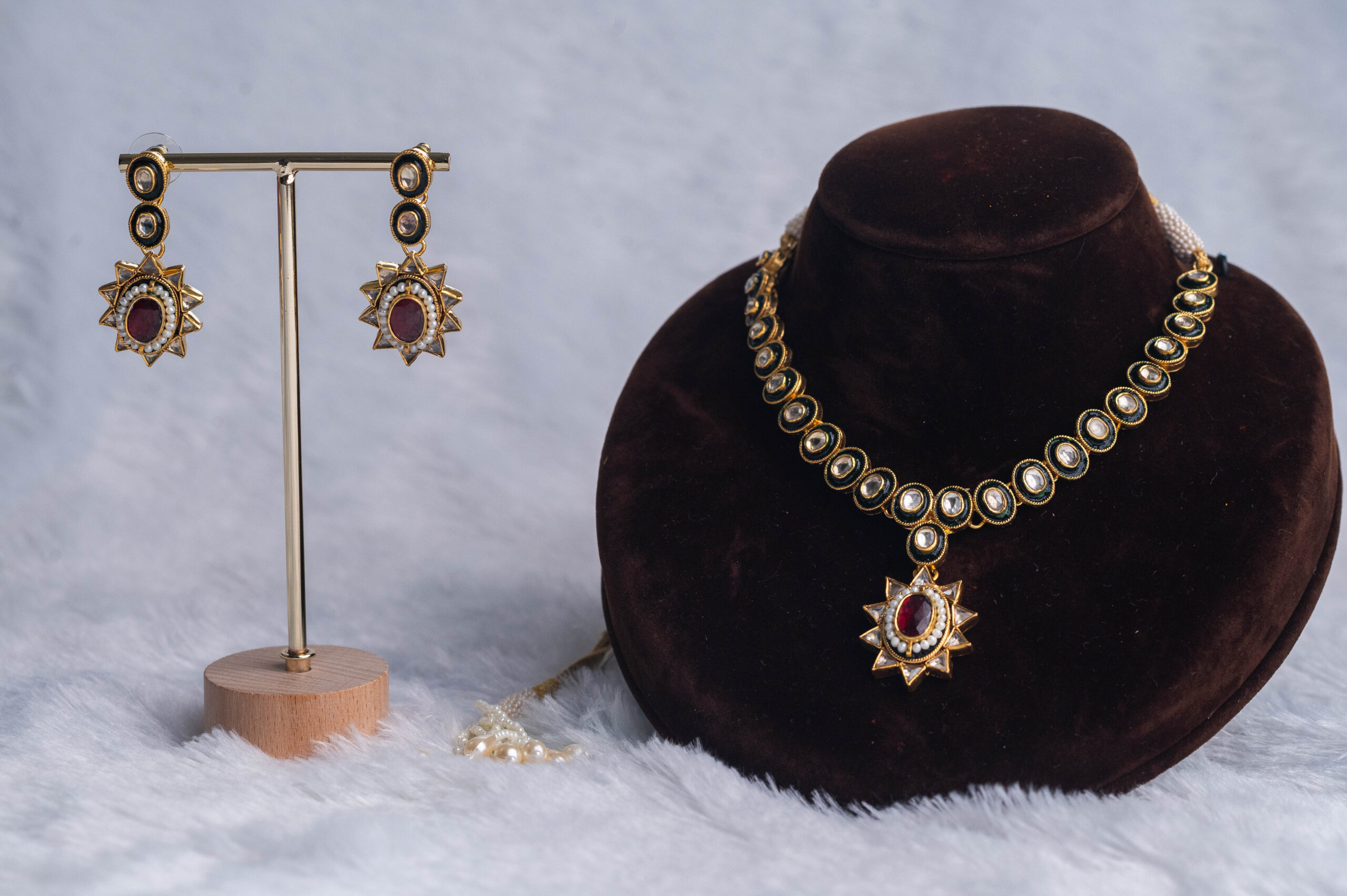 Exquisite kundan necklace set featuring emerald and ruby stones with matching earrings. Perfect for bridal wear, enriched with intricate craftsmanship and pearl drops.